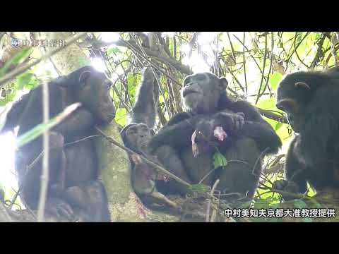 ヒョウはチンパンジーに獲物を奪われてしまいました。周囲の個体が物凄く羨ましそうに見ています。京大の映像です。