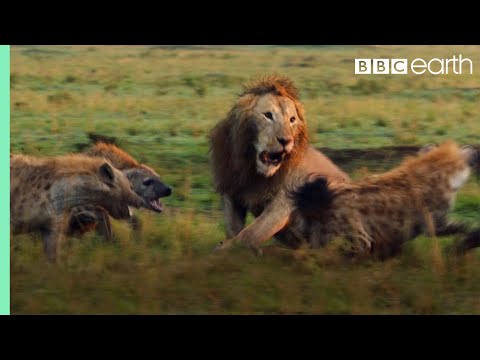 こちらのオスラインは20匹のハイエナに囲まれてタジタジです。