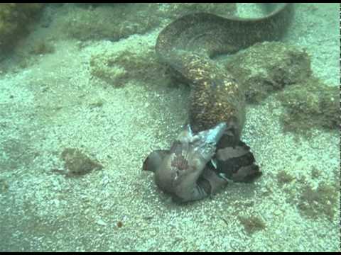 ウツボがタコを捕食しています。懸命に逃げますが抵抗虚しく…。